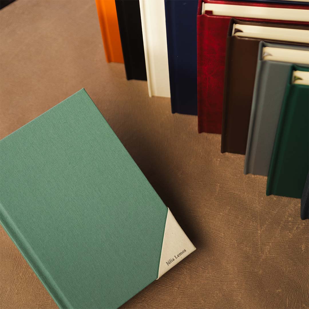 Capa dura revestida em material sintético ou tecido, com acabamento artesanal