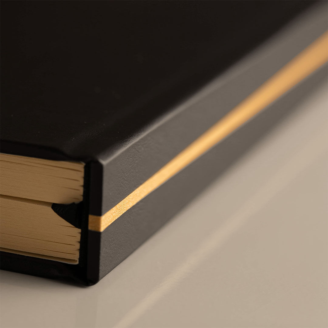 Capa dura revestida em material sintético na cor preta com detalhe dourado na lombada;