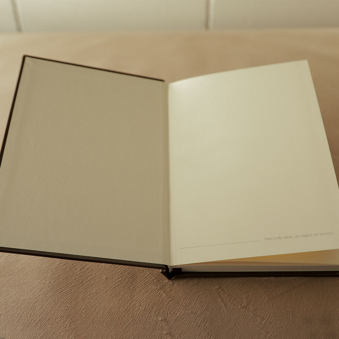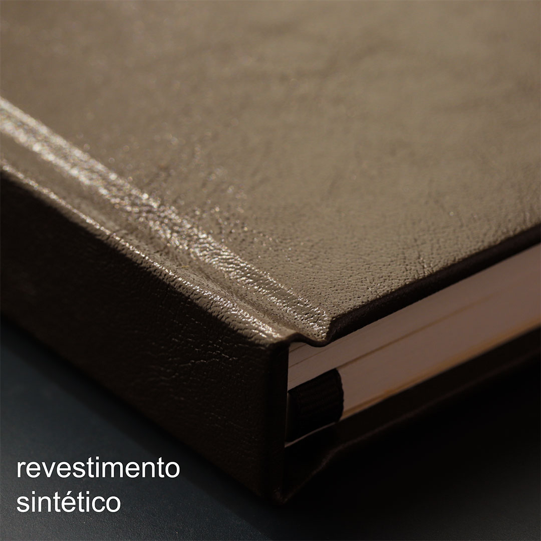 • Capa dura revestida em material sintético, com acabamento artesanal